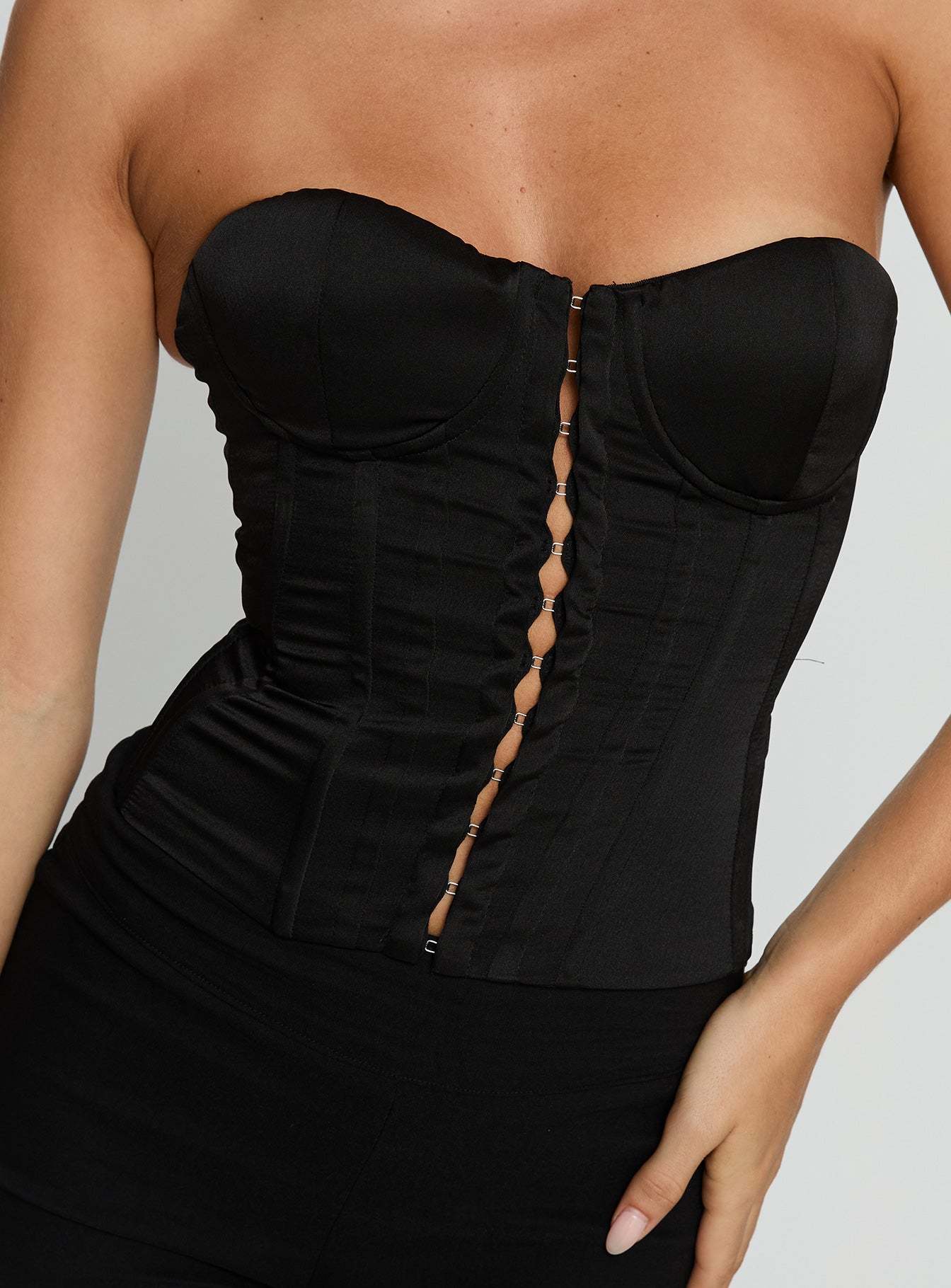 - Corset top in satin fabric with a strapless neckline