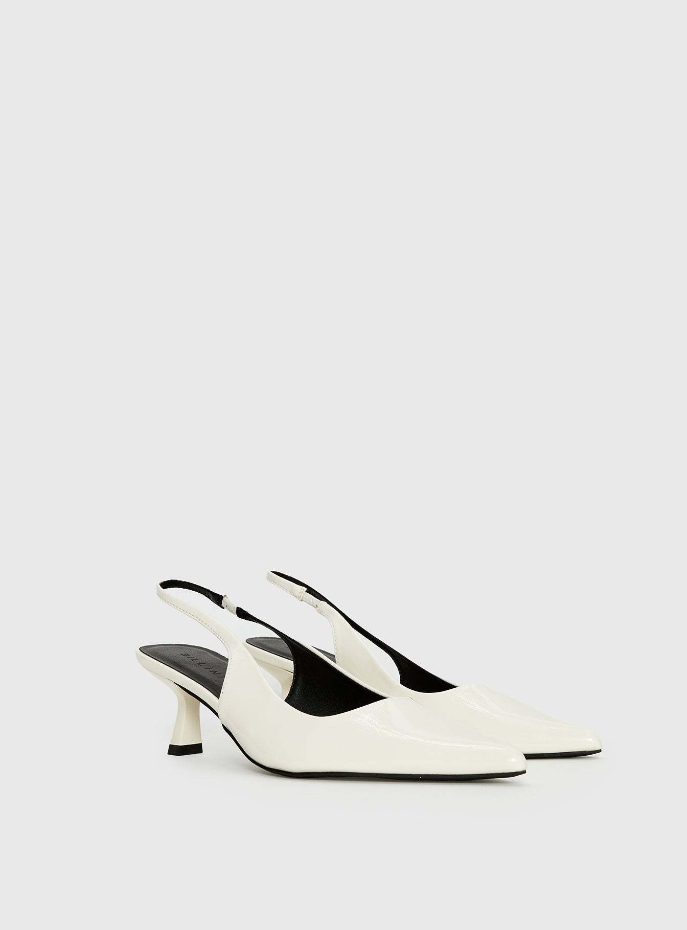 - Patent material look, pointed toe, sling back style, elasticated band fastening