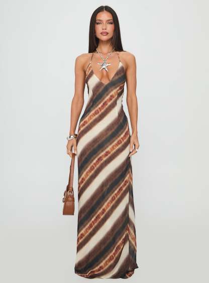 - Stripe print, scoop neckline, adjustable halter straps, tie back detail, zip closure at back