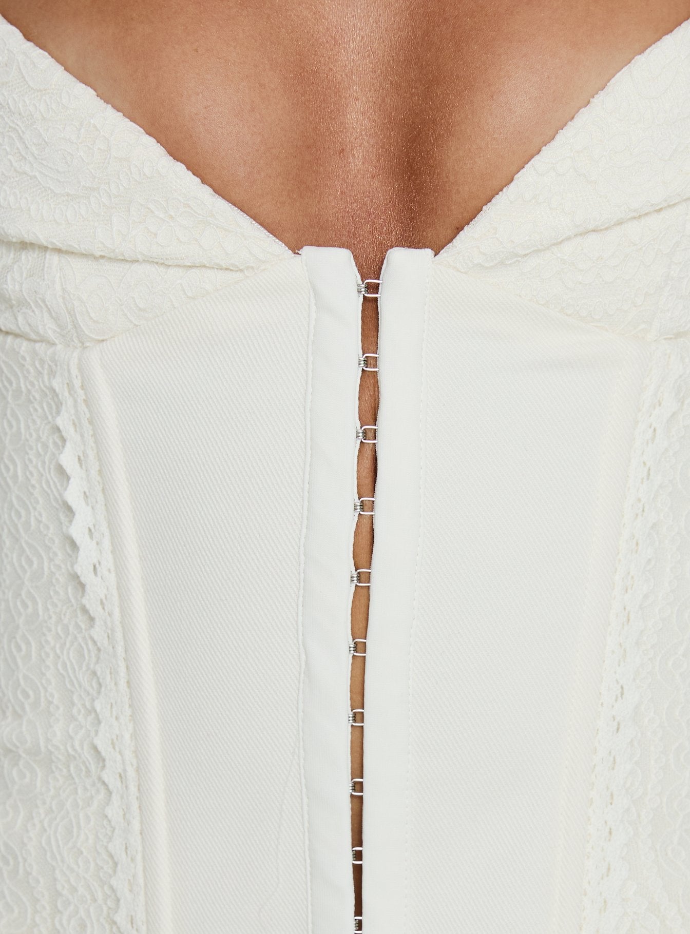 - Sweetheart neckline, hook closure, inner boning, adjustable straps, v-shaped hem, slim-fit