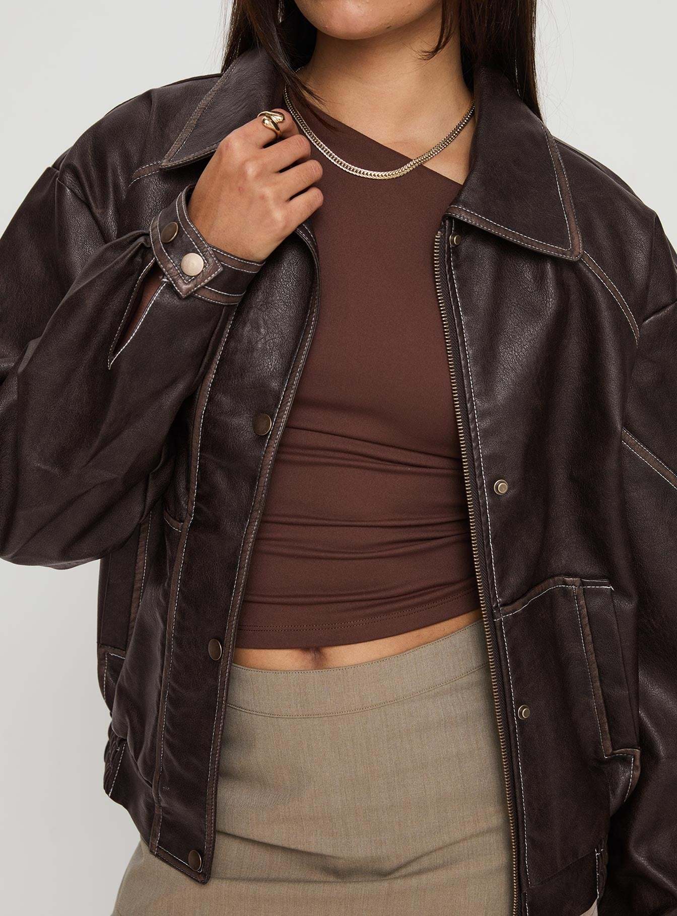 - Exposed stitching detail, button-up & zip closure, twin hip pockets, ribbed waistband, drop shoulders, buttoned cuffs, snap back button detail