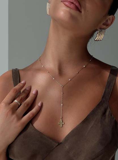 - Cross pendant, pearl detail, gold-tone hardware, lobster clasp fastening, adjustable length