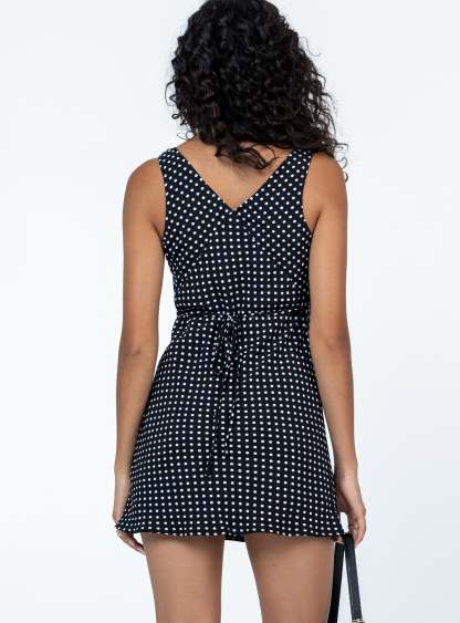- Plunge neck, zip closure at side, tie-back detail, a-line fit