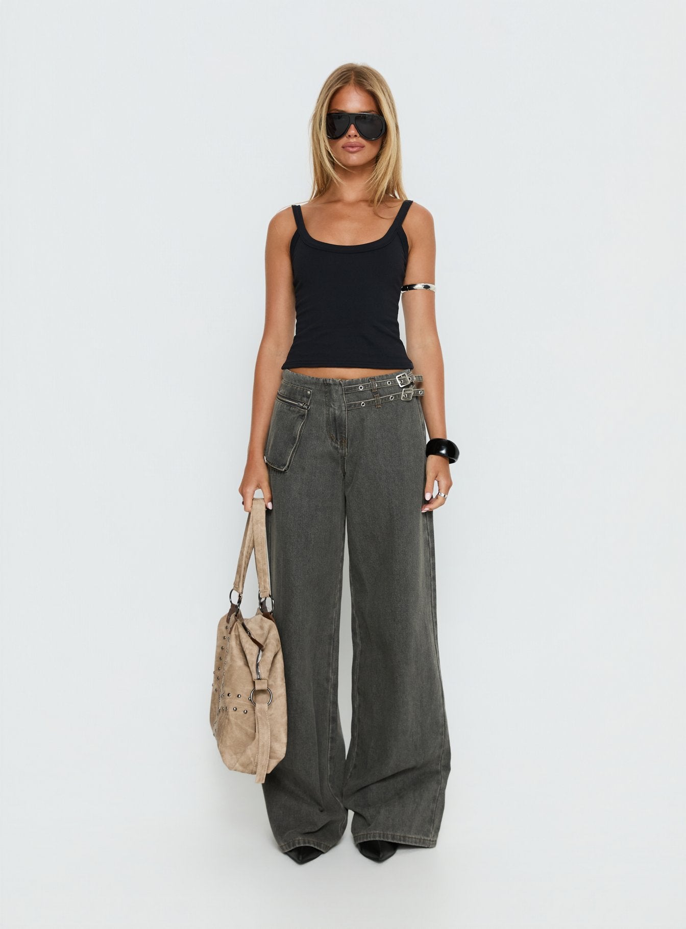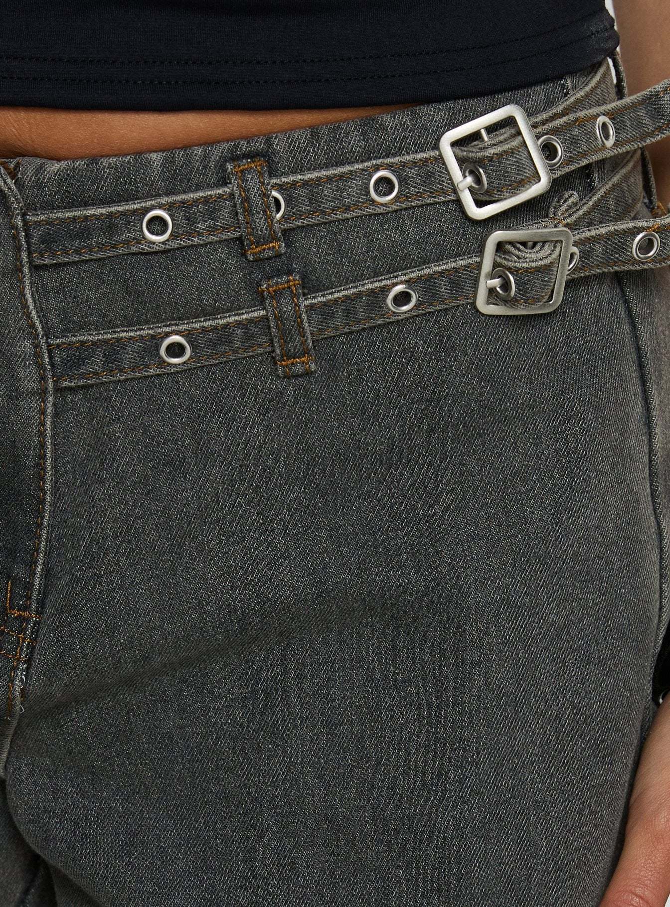 - Hook & zip closure, side pocket detail, adjustable buckle waist, silver-toned hardware