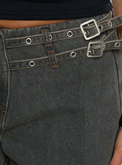 - Belted cargo mid-rise denim pants in a wide-leg cut