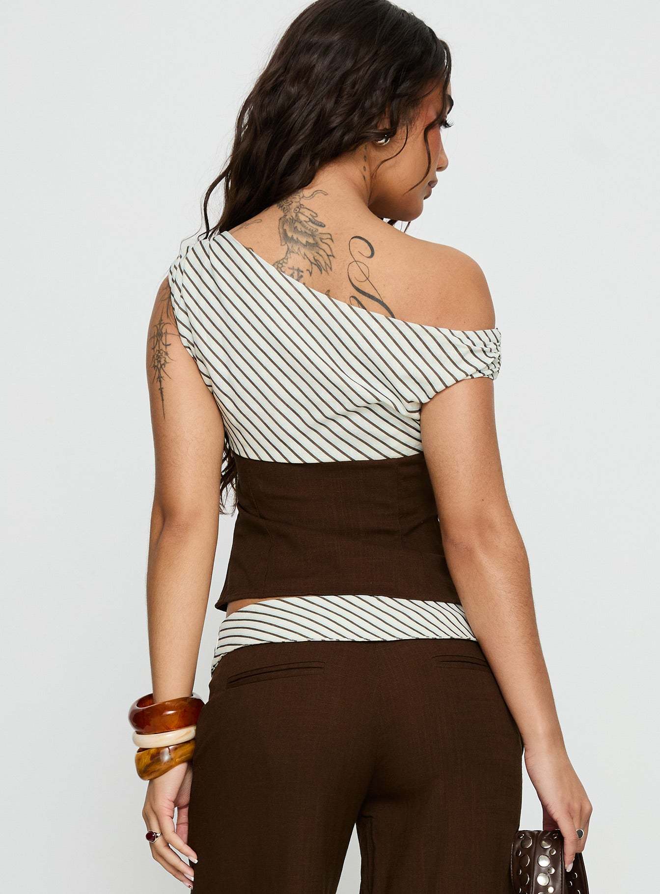 - Woven top with stripe print detail & one-shoulder neckline