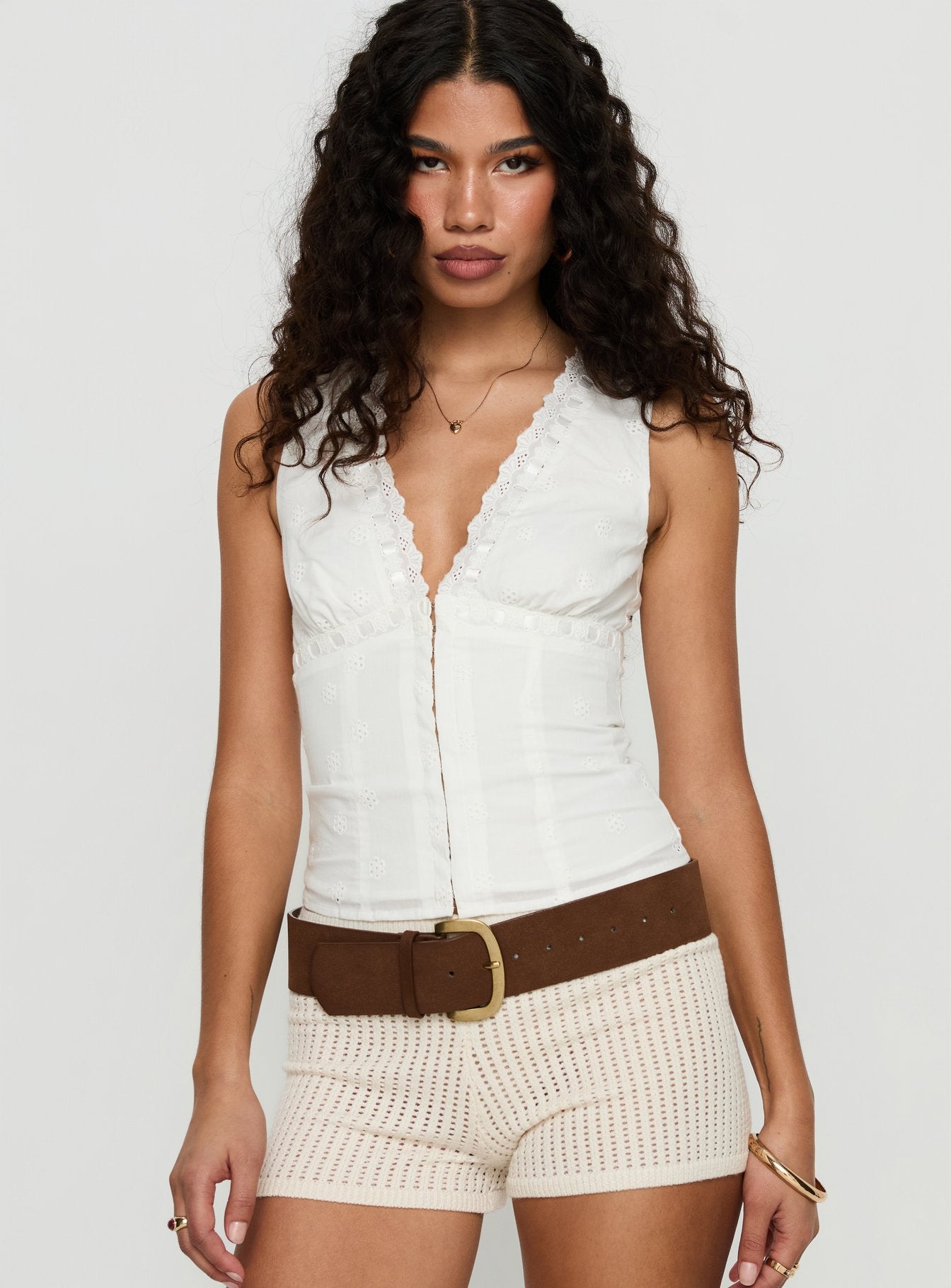 - Woven top with lace trim detail & sleeveless design
