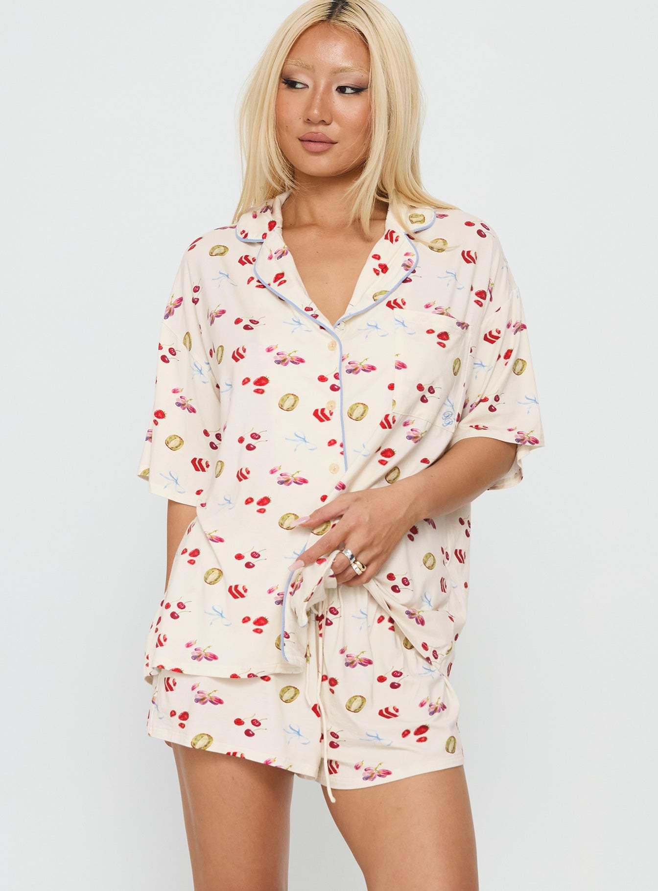 - Short-sleeve top, multi-print, collared, single breast pocket, cap sleeves, relaxed-fit shorts, elasticated waistband, tie closure, pocketless, mid-rise fit
