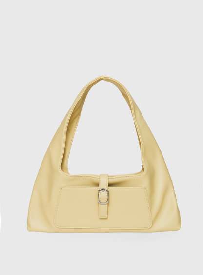 - Faux leather material, buckle detail, silver-toned hardware, front pocket detail, fixed strap, snap button closure, one main compartment with internal pockets